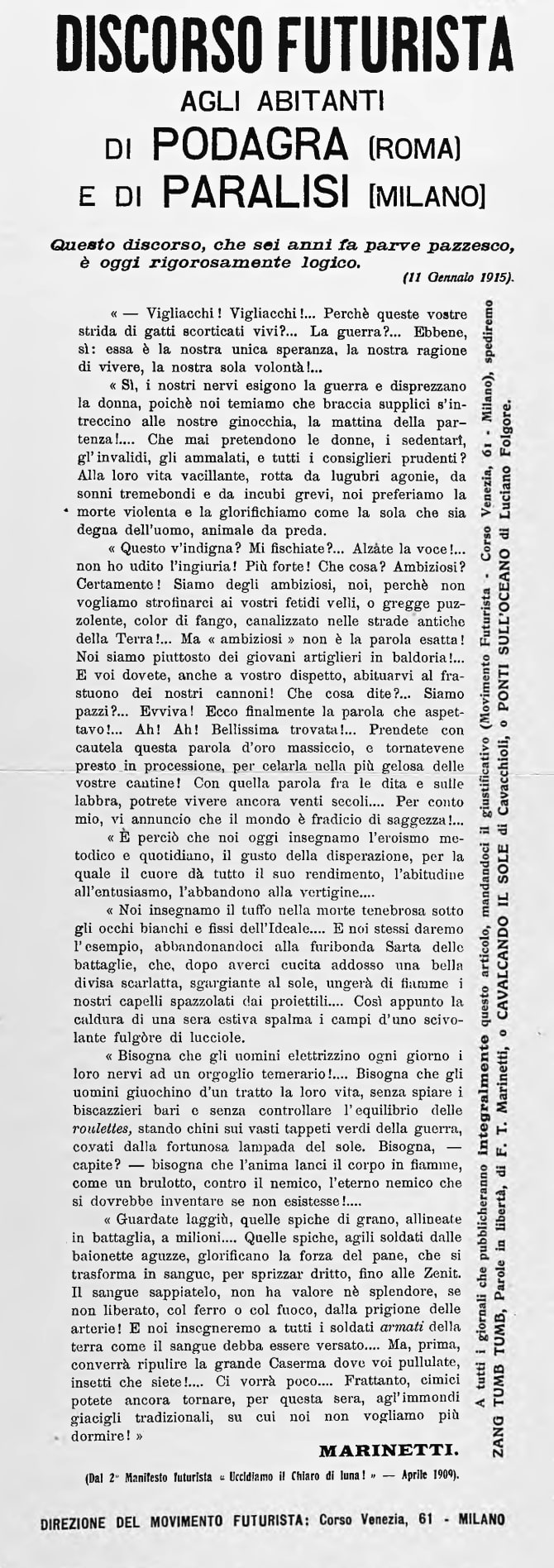 Title of Work (EN): Futurist Speech to the Inhabitants of Gout (Rome) and Paralysis (Milan)